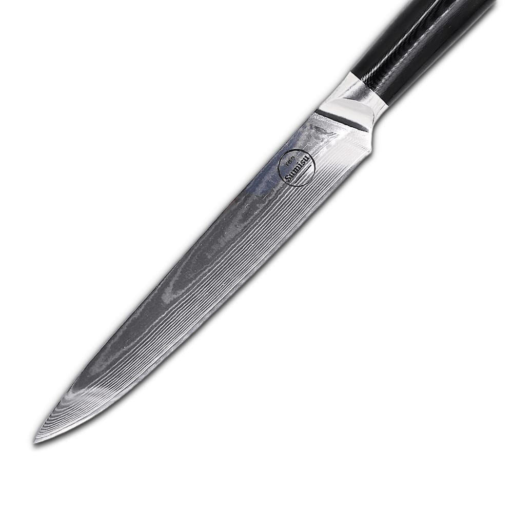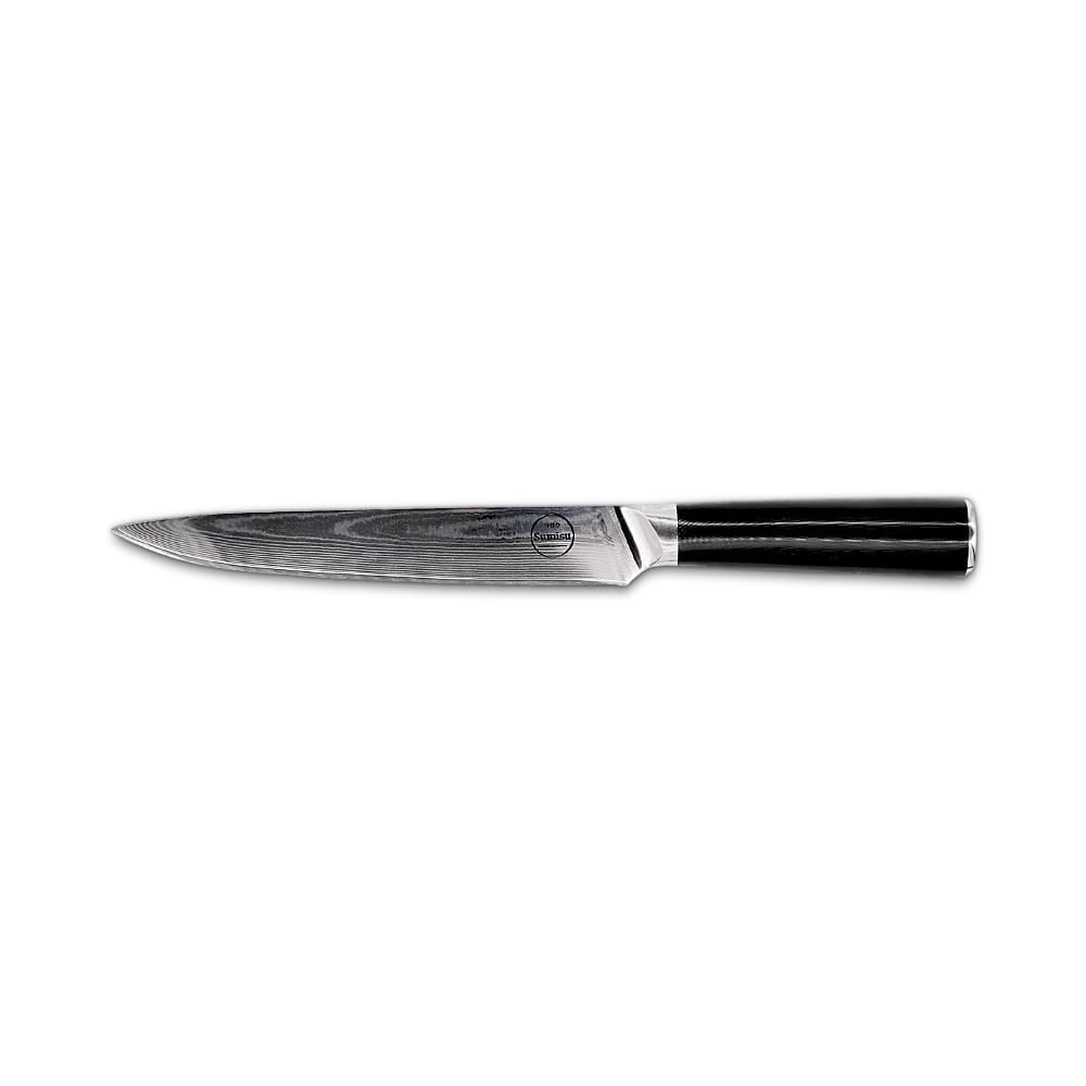 Die Klinge des Sumisu Yanagiba Black besteht aus 67 Lagen hochwertigem Damaststahl, was maximale Stärke und Langlebigkeit garantiert. Der Kern ist auf 60 HRC Rockwell gehärtet, wodurch die Schneide ihre Schärfe länger behält und mühelos durch Zutaten gleitet. Die einzigartigen Damastmuster auf der Klinge sorgen nicht nur für eine ästhetische Optik, sondern verbessern auch die Festigkeit und Flexibilität des Stahls.